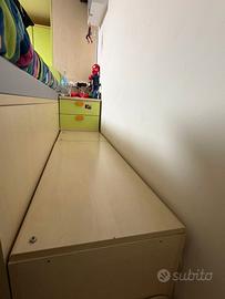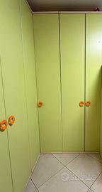 Armadio angolare 7 ante con cassettiera interna - armadio a ponte con scrivania - letto a castello con 3° letto a scomparsa - scale con vano contenitore e cassetti - comodino