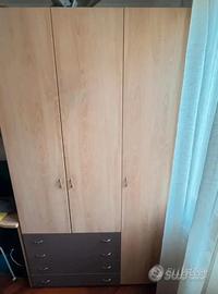 Cameretta attrezzata a ponte con due letti completa di armadio e scrivania.
