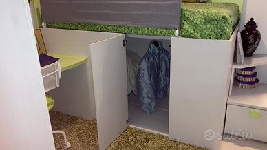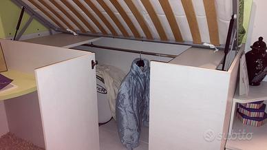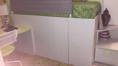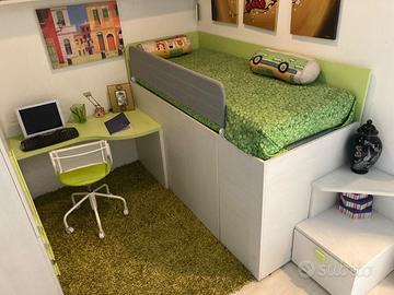 Cameretta marca Dielle con armadio 3 ante, scrivania con sedia girevole e mensole, letto soppalco con cabina armadio e scaletta