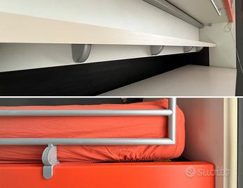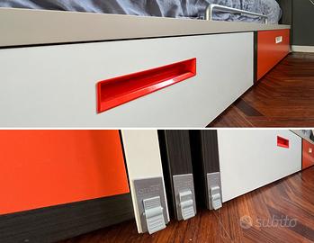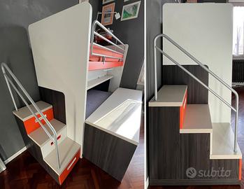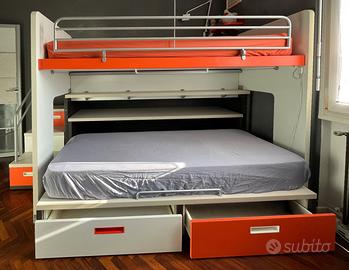 Vendo cameretta Doimo Cityline originale, soluzione salvaspazio completa di: •letto superiore con protezione •letto inferiore (estraibile) •scrivania estraibile integrata •scala contenitore con cassetti •cassettiera inferiore •ripiani interni •mensola superiore a parete Struttura solida e di qualità, ideale per cameretta ragazzi. Dimensioni principali (vedere foto): •lunghezza: circa 213 + 45 cm •altezza: circa 180 cm •profondità: circa 91 cm Colori: bianco, beige e arancione/corallo con finiture effetto legno wengé. Condizioni: complessivamente eccellenti, unico segno di usura sul piano della scrivania. Smontaggio e trasporto a carico dell’acquirente. Prezzo richiesto 1100€ (pagata nuova 3500€)