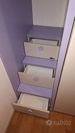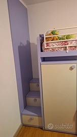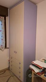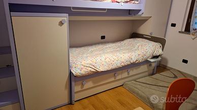 Vendo Cameretta Doimo Cityline, colori lilla e beige composta da due letti a castello più un terzo predisposto ma senza materasso, colonna armadio incluso nella struttura. dim 3.89x0.90 da chiusa e 3.89x1.30 con letto superiore esterno. prese con USB integrate nel pannello a parete. Incluso nel prezzo c'è anche un armadio con due ante e 4 cassetti abbinato alla cameretta dim. 0.98x0.60, completo di grucce per bambini.
