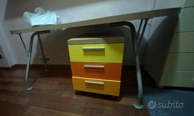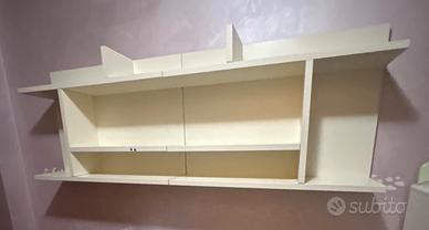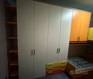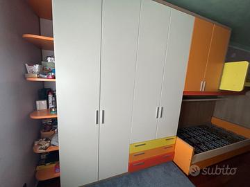 Cameretta per ragazzi, grande armadiatura, cassettoni sotto letto, gradoni contenitore, letto scorrevole, mensole e comodino cassettiera con ruote. Già smontata