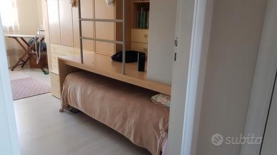 La misura totale della camera è di 4.10 metri, profondità armadio 55 cm. La larghezza della sola pedana è di 2,15 metri ed è profonda 1,20 cm. Il letto misura 190 x 85 cm, la scrivania è larga 115 cm e profonda 56 cm, infine la colonna angolare è profonda 46 cm. È in ottime condizioni ed il prezzo basso è dato dalla necessità di liberare gli spazi causa trasloco.Solo un frontale di un cassetto è leggermente lesionato, causa trasloco.