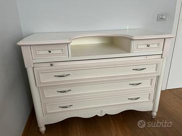Cameretta composta da un comodino con 2 cassetti ,una scrivania con cassetti , una cassettiera e 2 letti imbottiti:uno provvisto di un letto in più estraibile ed uno con cassetto contenitore.