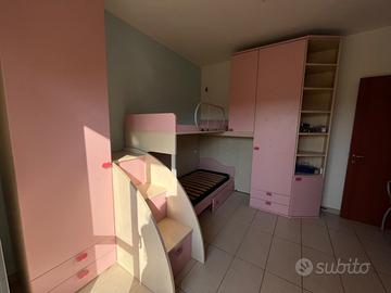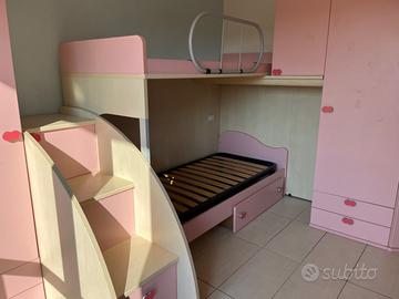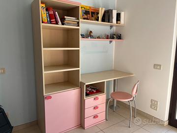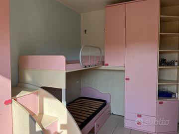 Mobili per intera cameretta componibile da bambina rosa con letto a castello, scala, ampi armadi, scrivania, sedia e scaffali. Si può cambiare la disposizione. Sono presenti alcuni difetti. Ritiro in loco e prezzo trattabile Altezza 260cm Lunghezza letto 310cm Mobili lato corto con angolo 250cm Mobili lato scrivania 180cm Per info e misure scrivetemi pure in chat