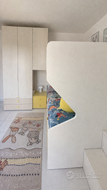 Cameretta per bambini NIDI, anno 2018, con composizione angolare completa di letti a castello e armadiature alte. Inclusi nella vendita comodini e materassi. Soluzione funzionale e salvaspazio, in ottime condizioni. Altezza: 258 cm Lunghezza lato letti: 356 cm Lunghezza lato armadio 220 cm Profondità: 60 cm