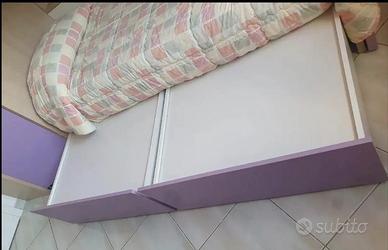 Svendo causa trasloco cameretta per n.2 ampia e funzionale di ottima fattura acquistata da noto mobilificio della zona avente produzione propria. Molto capiente e dotata di molteplici spazi contenitori. Color rovere chiaro, lilla e bianca. Composta da: - Armadio a cabina con doppia appenderia e n.6 ampie mensole ognuna delle quali avente lunghezza 90 cm. - Doppio letto a soppalco - Comodissimo armadio basso per cambio stagione posizionato sul retro del letto posto in basso lunghezza 200 cm.ante color bianco, interno rovere chiaro. - Due ampissimi cassettoni a scomparsa posizionati sotto il letto lunghezza 97 cm. profondità 80 cm. ognuno. - Due profondi cassetti sui gradini che conducono al letto posto nella parte superiore del soppalco - Cassettiera con rotelle composta da n.4 cassetti. - Lunghezza struttura letto 208 cm. Disponibile ad inviare ulteriori foto anche per visionare l'interno degli armadi. Eventuale spedizione a cura e a carico di chi acquista con spese da quantificarsi.
