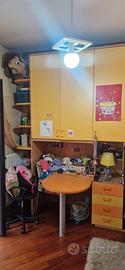 cameretta struttura colore noce, con ante e cassetti laccati arancio e giallo.
