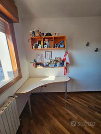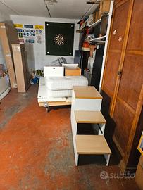 cameretta con letto a castello, comprende due reti con due materassi, mobile contenitivo con tre gradini, mobile a doppia anta, scrivania, mensola doppia, il tutto è smontato e pronto per il ritiro in garage, comodamente caricabile in un furgone