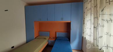Cameretta usata ma in buono stato, con armadio a ponte, due letti (senza materassi), comodino, cassettiera con sette cassetti, scrivania e sedia con ruote.