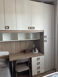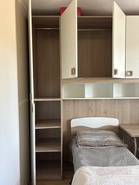 Cameretta doppio ponte 7 ante, con libreria sospesa, in dotazione due letti singoli con rete (no materasso) e comodino compresi nel prezzo.
