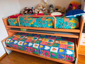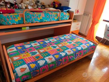 struttura con doppio letto cm 211x116x93, letto superiore con pratico meccanismo di ribaltamento, ampia scrivania incorporata estraibile cm 204x91, letto inferiore scorrevole cm 202x91, entrambi i materassi inclusi , armadio/cassettiera cm 90x198x60, mobiletto/comodino cm 48x153x60, mensola arancio cm 112x29x3.