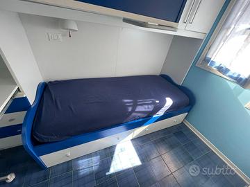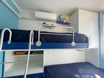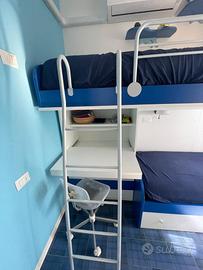 Cameretta con due letti, cassettiera e scrivania sotto a un letto e armadietto sopra l’altro letto, il quale ha due cassetti sotto. Smontaggio e ritiro a carico dell’acquirente. Dimensioni: larghezza totale 295cm, altezza massima armadio 26cm, larghezza 95cm. Misure dei letti 200 per 90 cm.