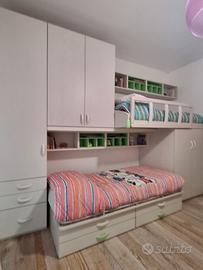 Cameretta di dimensioni: lunghezza parete 3,50 m, altezza colonna/pensili 2,60 m, profondità colonna/pensili 0,50 m , profondità cabina armadio/letto sopra 0,95 m. La cameretta è in buono stato, con letto sotto dotato di doppi cassettoni, con ruote (da sostituire per un miglior scorrimento), scaletta per salire a pioli. La cameretta è già smontata e tutta perfettamente imballata. Da rivedere un pannello di schienale posteriore della cabina armadio .