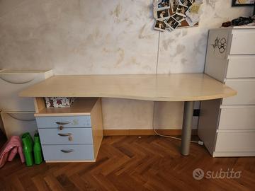 Vendo cameretta come da foto, con armadio 2 ante (larghezza 95, altezza 228, profondità 46), 2 mensole (una azzurra l'altra blu, lunghezza 150, profondità 30), scrivania (lunghezza 160, profondità 60 e nella parte più larga 70', altezza 71). Visibili a Mirano, smontaggio e trasporto a carico dell'acquirente. Non spedisco. Prezzo leggermente trattabile.