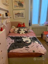 Vendo cameretta causa trasloco. La cameretta ha solo due anni. Composta da letto 140x190cm letto piazza e mezza con materasso di grande qualità. Il letto ha la testiera imbottita da tappezziere ed é sfoderabile. Il letto ha le ruote e si può facilmente spostare. Sotto ci sono due cassetti contenitori grandi quanti tutti il letto. Scrivania con 3 cassetti profondi. Pouf contenitore imbottito (leggermente macchiato). Libreria in legno bianca e rosa con due ripiani. Cassettiera con 7 casetti capienti come da foto.