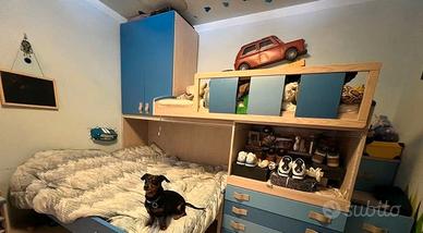 Vendo causa cambio tipologia di arredo cameretta “G.S.G.” Soppalco New Cross struttura olmo cielo/avio La struttura è composta da 3 letti di cui uno a soppalco ed uno estraibile dal letto singolo inferiore, diventando un letto matrimoniale ; questa disposizione permette di sfruttare, in tutta sincerità, ogni centimetro della stessa cameretta, in modo intelligente e funzionale. La posizione del letto a soppalco in alto presenta diversi vantaggi: dall’isolamento dell’angolo dedicato al riposo, alla disponibilità di uno spazio libero a terra in cui il bambino possa muoversi in libertà, giocare o fare altre attività. È la tipologia di cameretta più amata dai bambini per la sua praticità: per raggiungere il letto a soppalco ci sono le classiche scale a pioli, le stesse, robuste e compatte, fungono anche da vani contenitori. Altresì la struttura è dotata di scrivania estraibile, con la possibilità di farla rientrare nel suo alloggiamento a scomparsa, sotto la stessa troviamo nr 4 cassetti dotati di ammortizzatori. Il tutto si sviluppa nei 4 metri lineari dove sono compresi un armadio a ponte adiacente ad una colonna armadio, tutte le ante sono ammortizzate. Quest’ultima per ovvi motivi di spazio, non riuscimmo a inglobarla nella linearità del montaggio, quindi fù posizionata in una diversa locuzione.