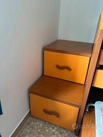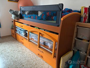 Vendo cameretta completa marca Giessegi in ottime condizioni, robusta e funzionale, ideale per bambini o ragazzi. Struttura solida con molti spazi contenitivi. La cameretta è composta da: • Letto singolo con struttura contenitore Dimensioni: 200 × 110 × 92,5 cm Materasso: 190 × 80 cm Dotato di 6 cassettoni capienti sotto il letto. • 2 scrivanie estraibili integrate nella struttura del letto. • Gradini contenitore con cassetto Larghezza gradini: 50 cm. • Armadio a 4 ante con cassetti inferiori Dimensioni: 181 × 90 × 47 cm. • Comodino Dimensioni: 51 × 57 × 42,5 cm. • Scrivania curva con cassettiera integrata Dimensioni: 130 × 75 × 60 cm. + 2 sedie, piccola pattumiera e cuscino. La cameretta è stata acquistata nuova ed è stata utilizzata con cura. Tutti i mobili sono in buone condizioni e perfettamente funzionanti. Colore legno chiaro / ciliegio con elementi arancio. Vendita completa. Smontaggio e trasporto a carico dell’acquirente. Per qualsiasi informazione o per altre foto scrivetemi.
