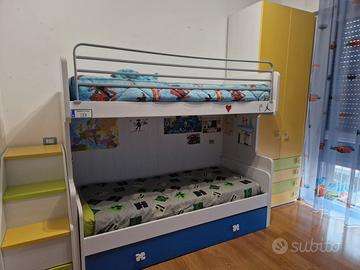 Vendo cameretta.in ottimo stato. Già smontata da ritirare piano terra. Letto a ponte, letto e cassonetto con altro letto. Scala laterale con gradini porta giochi e mobile con due ante e 4 cassetti.