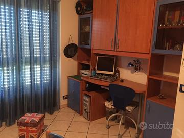 Vendo cameretta completa in stile moderno, in legno color ciliegio con dettagli blu, perfetta per ragazzi/e. Tutti i mobili sono in ottimo stato e molto robusti, ideali per sfruttare bene lo spazio grazie alla struttura ad angolo.