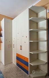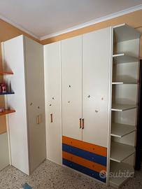 Vendo cameretta completa per ragazzi, in legno di alta qualità e in ottime condizioni, composta da: Armadio spazioso a 4 ante + cassetti Scrivania ampia con mensole Librerie abbinate, con ripiani e vani contenitivi Tutti i mobili sono in stile coordinato, color legno chiaro,arancio e blu. Struttura solida e ben tenuta. Dimensioni: -Armadio lunghezza totale 244cm., altezza 260cm - mensole (libreria n.1) lunghezza 133cm., larghezza 37cm., altezza 198 cm. - mensole (libreria n.2) lunghezza 80 cm., larghezza 37cm., altezza 200cm. - mensole (libreria n.3) lunghezza 133,5 cm., larghezza 37 cm., altezza 199cm. -scrivania (libreria n.3) larghezza 60 cm e lunghezza 133,5 cm