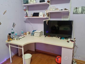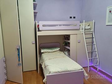 cameretta composta da sue letti di cui uno a castello, come da foto, comprensive di doghe. Armadio ad angolo con cassettiera. Terminale libreria, scaletta.Mensole interne. Scrivania grande con mensole. Spessore 3 cm. Colore panna/lilla. Disponibile da vedere se interessati