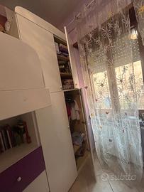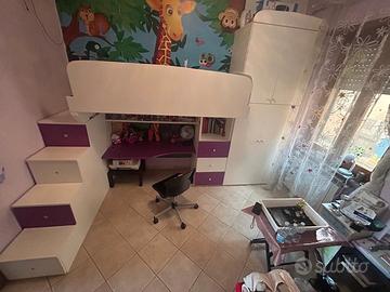 Cameretta artigianale in legno sviluppata a ponte con scrivania sotto e letto sopra....scalini a cassettoni e armadio 4 ante