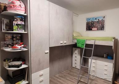 cameretta a soppalco spring nuova,tenuta bene h 2,45,lung lato armadio 287,lung lato letto 204.Scrivania 150×60,3 moduli 2 chiusi e uno aperto 92×32,como 4 cassetti 93×56,cassettiera piccola 6 cassetti 40×100.Ritiro a carico dell acquirente.