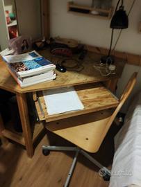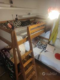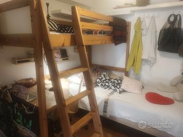 Cameretta totalmente in legno a soppalco, completa di scrivania angolare e sedia in legno con le ruote. Doppio letto con rete a doghe.
