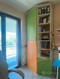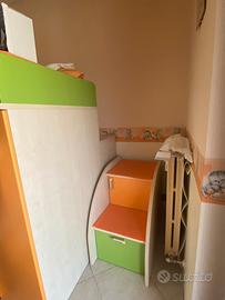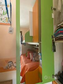 Cameretta in ottime condizioni, verde ed arancione . Fornita di: scrivania, mensole, primo armadio con anche scaffali, secondo armadio con specchio, terzo armadio di fianco al letto, 6 cassettoni (essi sotto il letto , scale e sul letto superiore) due letti , scale per poter accedere al letto superiore , mensole anche nel ripiano superiore . Adatta per due persone , fornita di tutti i comfort.