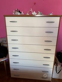 Vendo cameretta completa con due lettini singoli, due comodini, cassettiera da 9 cassetti con armadio e porta tv. Nelle foto manca la scrivania completa con sedia e mensole di varie misure per mancanza di spazio. Smontaggio a carico cliente