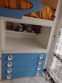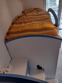 Vendo letto a castello con spondina, materasso incluso.Letto accessibile da tre gradini a cassettoni situati a sinistra. Sotto il letto c'è un armadio con profondità doppia a due battenti, appendi abiti davanti e mensole dietro. Scrivania a scomparsa con mensola. 4 cassetti sotto la scrivania.