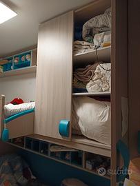 vendo cameretta con letto a castello, grande capacità dell' armadio. Smontaggio e trasporto a carico dell' acquirente. letto inferiore con grandi cassetti.Mensole capienti, tutto come in foto. Materassi esclusi perché usati ma se interessati li cedo nel prezzo. Trattabile.
