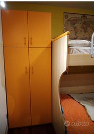 Letto a castello con scaletta laterale a cassettoni (contenitori), con due comodini ed un armadio a due ante in ottimo stato.