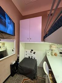 Completa di armadi, cassettoni contenitori, cassettiera e scrivania. Colore bianco e lilla.