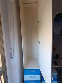 Letto a castello, armadi, cassetti e scrivania, scalette con sportelli per contenere oggetti. Rete per materasso