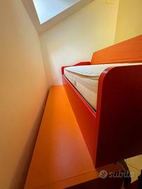 Cameretta per bambini/ragazzi con due letti a castello: quello superiore con protezione laterale in metallo, quello inferiore con ruote che si possono bloccare, scaletta con vani contenitori, passaggio letto e due lunghi cassetti sotto al letto inferiore. Colori: arancio, rosso e olmo naturale.