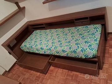 Cameretta in noce composta da letto singolo con due cassettoni, libreria su due lati con vano per cuscino in testata, tre mensole da parete e scrivania con un cassetto e due vani
