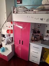 vendo cameretta con scrivania e scala con cassetti. nel primo gradino c'è una piccola scheggiatura colore fucsia laccata. ritiro a carico del acquirente.