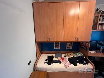 Cameretta con 2 letti a ponte, scrivania 130x60 cm, cassettiera con 5 vani a giorno, pensile sopra la scrivania con anta a vetro.