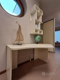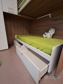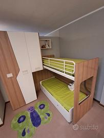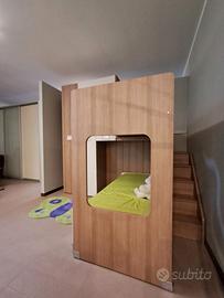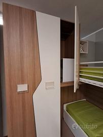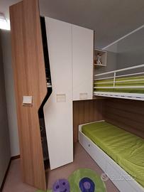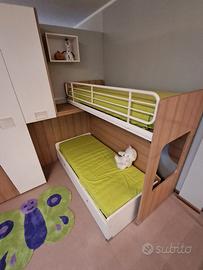 Cameretta Mistral,in Laminato, angolare con scala contenitiva e letto superiore a soppalco scorrevole + secondo letto inferiore su ruote con cassettoni estraibili MISURE: L 275 x P 210 compreso box sospeso a giorno + Scrittoio cm 130 ( Escluso Trasporto e Montaggio )