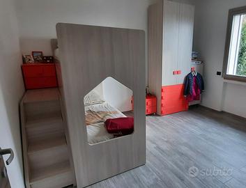 Vendo cameretta olmo con due lettini 80x 190 a doghe completa di due comodini a cassetto color papavero, armadio diviso in due : cassetti e ripiani.