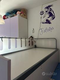 2 postazioni letto una alta (83cm x 2m) ed una bassa (non disponibili letti e materassi), letto alto accessibile attraveso una scala a contenitore molto robusta ed apribile. I contenitori delle scale sono MOLTO capienti (3 cassetti larghi 45cm x 35cm e un contenitore di 35cm x 1m.