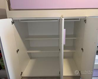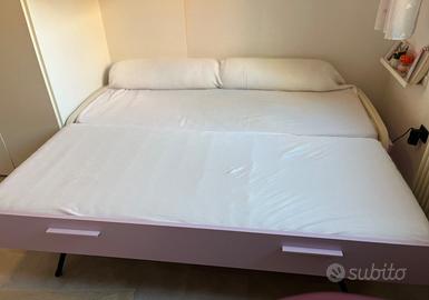 Cameretta moderna con 3 letti, marca Clever, scale a contenitori, ampio spazio armadio sotto il letto rialzato con profondità circa 80 cm. Terzo letto estraibile alla stessa altezza formando un letto matrimoniale. Le reti con doghe di legno e materassi sono inclusi. Colore neutro: bianco, beige e malva. Ottimo stato, da ritirare e smontare a Modena (non si fanno spedizioni).