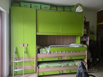 Presenta 2 letti a castello con ruote quindi facili da spostare,armadio a ponte con ante superiori ai letti con aste che si abbassano.