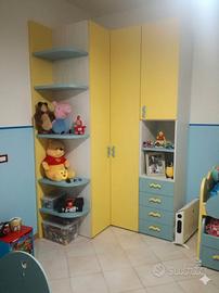 Composta da ampio armadio angolare con 2 ante tutta altezza, una a mezza altezza e 4 cassetti. doppio letto con quelli di sotto a scomparsa e 2 cassettoni, scrivania dalle dimensioni generose senza sedia, libreria spaziosa e 2 mensole, tutto di ottima qualità!