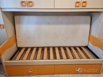 Cameretta Mondo Convenienza modello Alfa, con composizione angolare, armadio a ponte, armadio laterale con tre ante e quattro cassetti, cabina armadio angolare, si aggiunge anche un modulo con due ante in alto e vano sottostante a giorno per eventuale scrivania. Il letto è con la rete a doghe e ha due comodi cassetti sotto. Misure: Profondità 60 cm, Altezza 260 cm, Lunghezza 1°. 350 cm (lato del letto), 2°. 210 cm (lato cabina armadio). La cameretta si vende con materasso a parte. Ottimo stato.