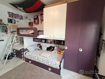 Cameretta Mondo convenienza tipo SIERRA colore bianco/prugna composizione come da foto. Ottime condizioni. Altezza 2700mm - Larghezza 4000mm Completa di ripiani interni. Materassi esclusi. Ritiro presso