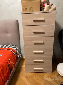 Vendo per cambio arredo totale, i seguenti elementi di camera di Mondo Convenienza colore olmo naturale: comodino con due cassetti, due mensole (modello con boiserie, vedi foto catalogo) ancora imballate e un settimino con 6 cassetti. I pezzi sono anche vendibili singolarmente e il trasporto è a carico dell’acquirente, li consegnamo all’acquirente a piano strada. Sono a disposizione per misure e info. Tutto in ottime condizioni/ pari a nuovo. No perditempo.