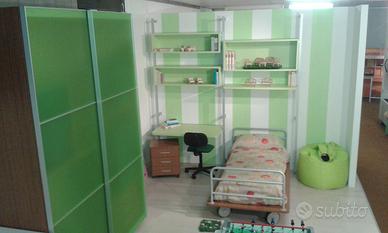 cameretta nuova da esposizione , visionabile presso nostra sede, realizzata tutta in spessore da 2,5 cm! struttura armadio in laminato teak, mentre le parti verdi mela sono LACCATE.